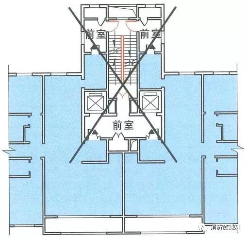 前室是防烟楼梯间的基本要素,安全疏散应遵行“走道(或户门)→前室→楼梯间”的基本规则。进入前室,就已抵达安全出口,应从疏散楼梯撤离,不能再进入了另一个前室,更不能通过走道(不安全区域)进入了另一个前室。