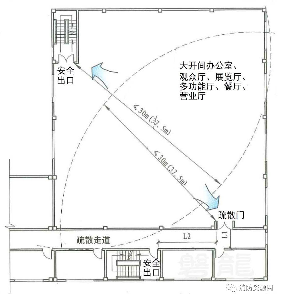 2、疏散门可以通过长度不大于10m(12.5m)的疏散走道通至最近的安全出口。以上图示1中,(L1+L2)不应大于10m(12.5m)。